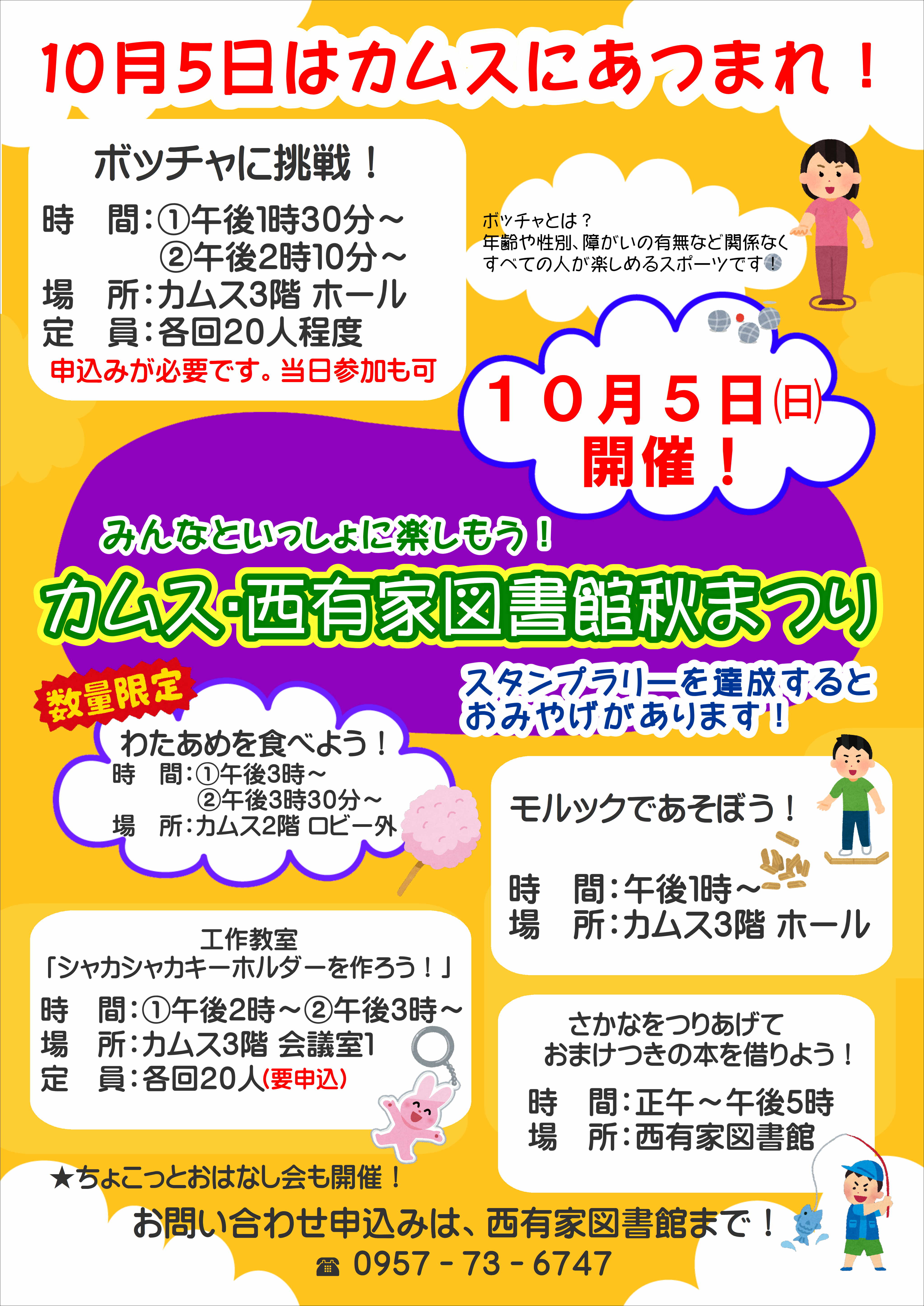 楽しいイベント盛りだくさんのカムス・西有家図書館秋まつりです♪ 詳しくは下のポスターをチェックしてみてくださいね☟